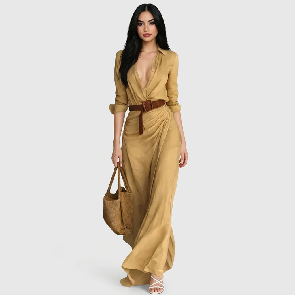 Con un escote abierto tipo camisero y mangas largas con puños, este vestido equilibra sensualidad y refinamiento en una misma línea. Su caída ligera y movimiento orgánico lo convierten en el look perfecto para escapadas mediterráneas, brunch urbanos o tardes doradas junto al mar.