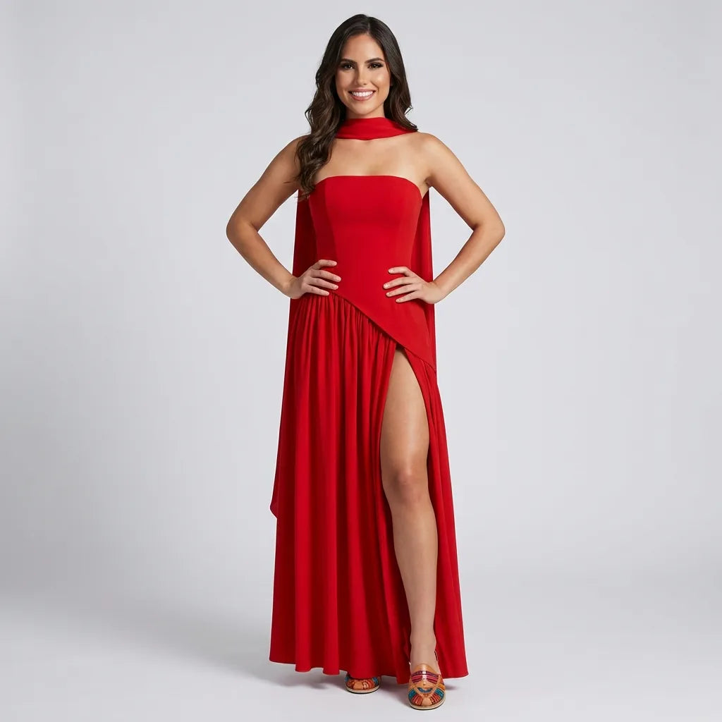 El Vestido Largo Rouge Amélie Slit es una pieza magnética y sofisticada diseñada para dominar cualquier ocasión especial con un aire de glamour europeo absoluto. Su estructura tipo corset sin tirantes estiliza el torso con una silueta limpia y escultórica, mientras que el cuello halter minimalista aporta un toque moderno y refinado.