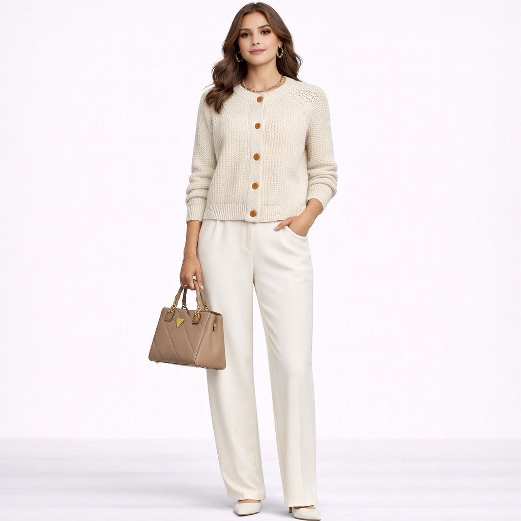 El Cárdigan Amélie Soft es una prenda delicada y luminosa que aporta un toque romántico y femenino a cualquier look. Confeccionado en punto suave efecto alpaca, presenta cuello redondo, mangas raglán y un cierre frontal con botones que realzan su diseño limpio y elegante. Su corte holgado lo convierte en una opción ideal para estilismos cómodos y cuidados, perfectos para el día a día.